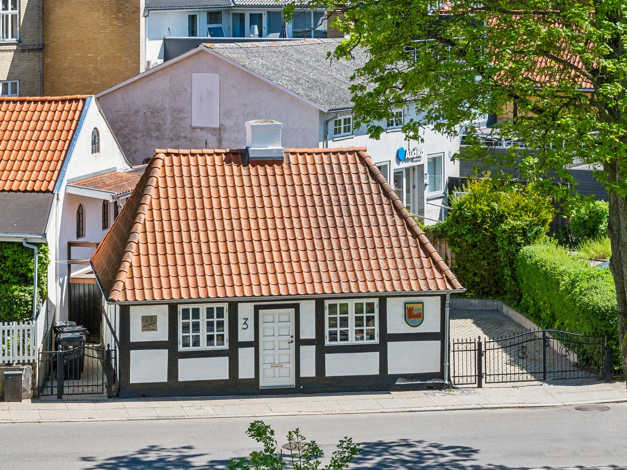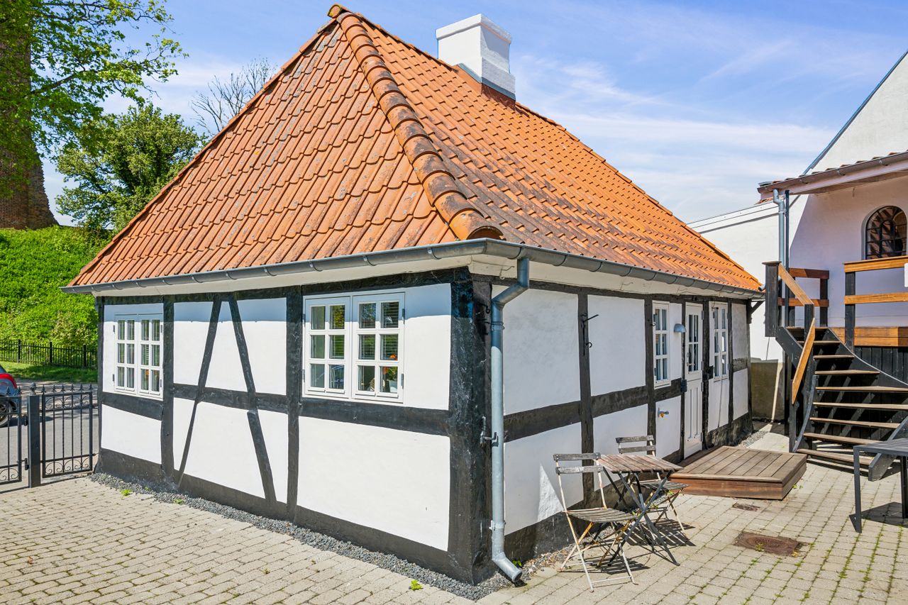 Ejendommen fremstår i flot stand med charmerende bindingsværk og opvarmes effektivt via fjernvarme. Udenfor kan du nyde dit eget private gårdhavemiljø – ideelt til sommergrill eller stille morgenkaffe under åben himmel. Med egen parkering på grunden bliver hverdagen nemmere, især når du bor så centralt.